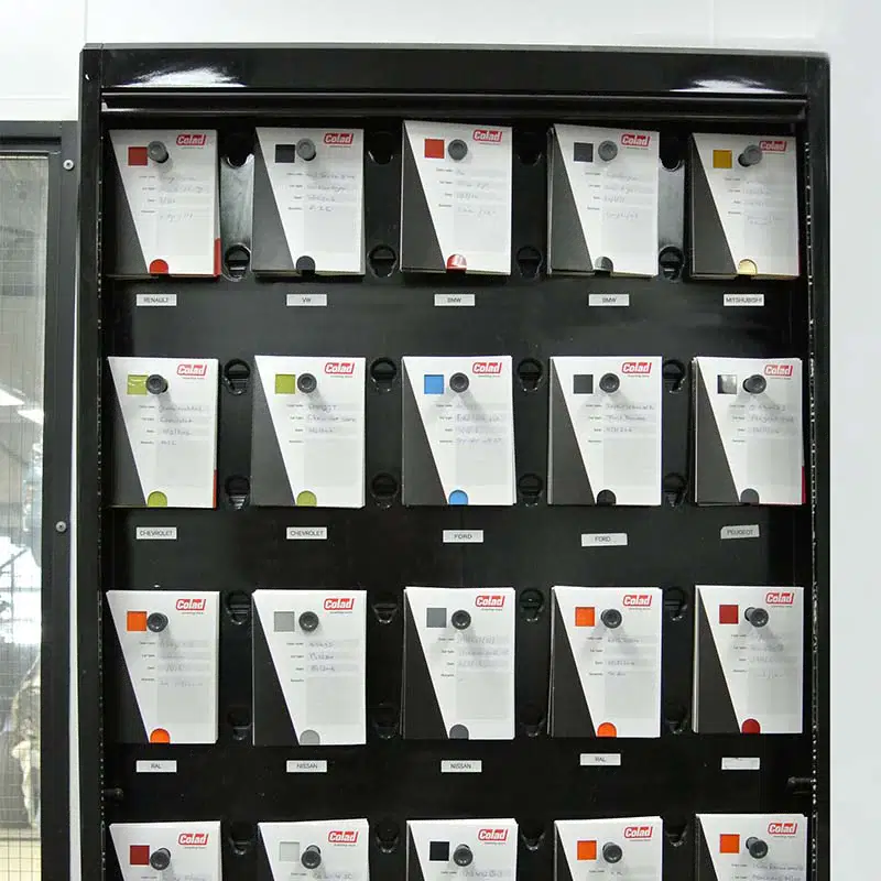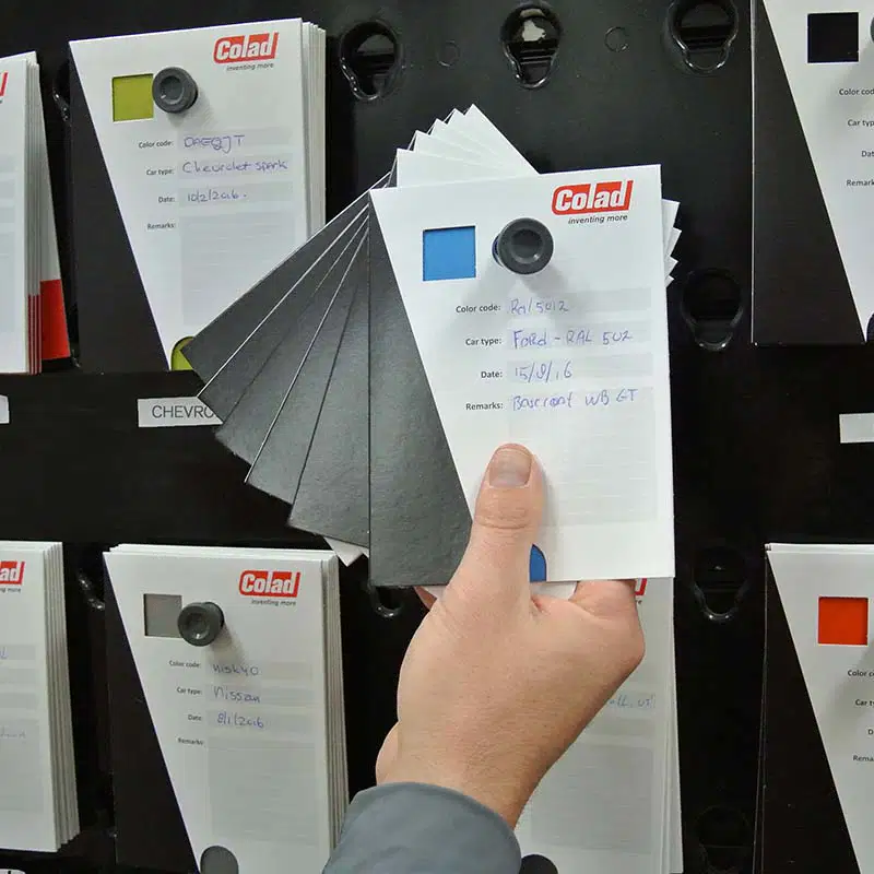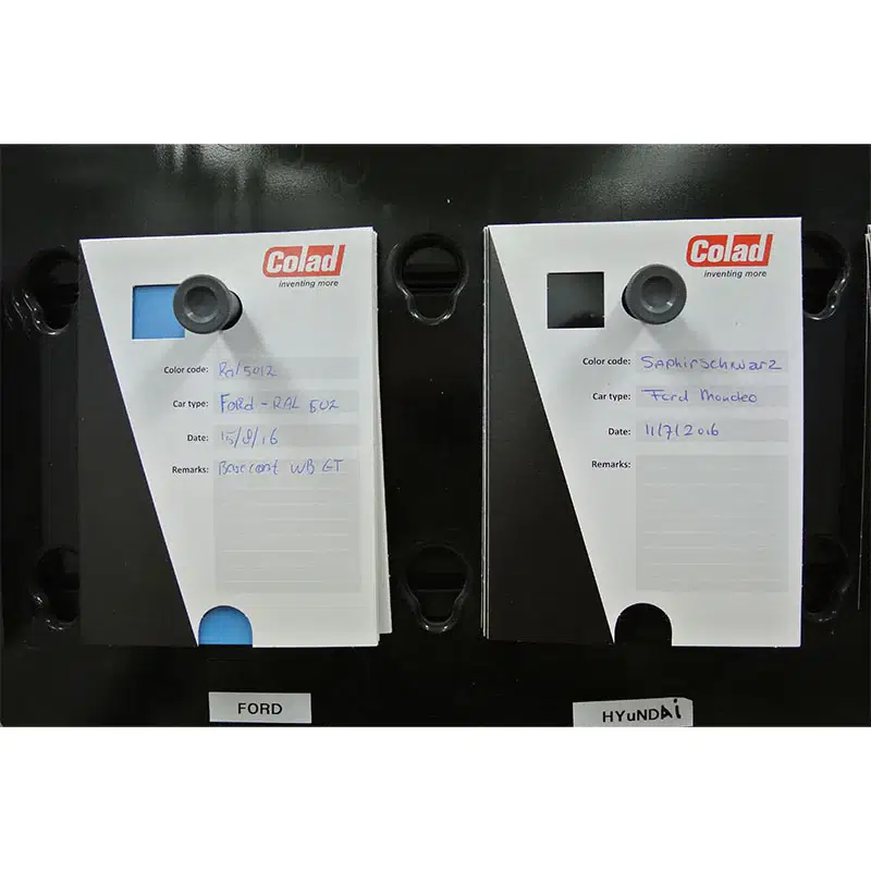 Aceste huse mici de carton oferă spațiu pentru o mostră de spray Colad vopsită. Informațiile de bază despre dată, tipul mașinii, codul culorii și observațiile pot fi listate pe husă. Când este depozitată, culoarea este vizibilă dintr-o privire prin orificiul pătrat din partea din față a husei. Per set de 250 de bucăți.