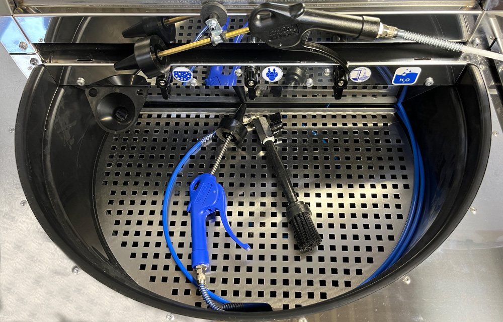 Perie cu flux continuu și pistol de clătire cu soluție reciclată pe bază de apă. (Apă de la robinet opțional.)