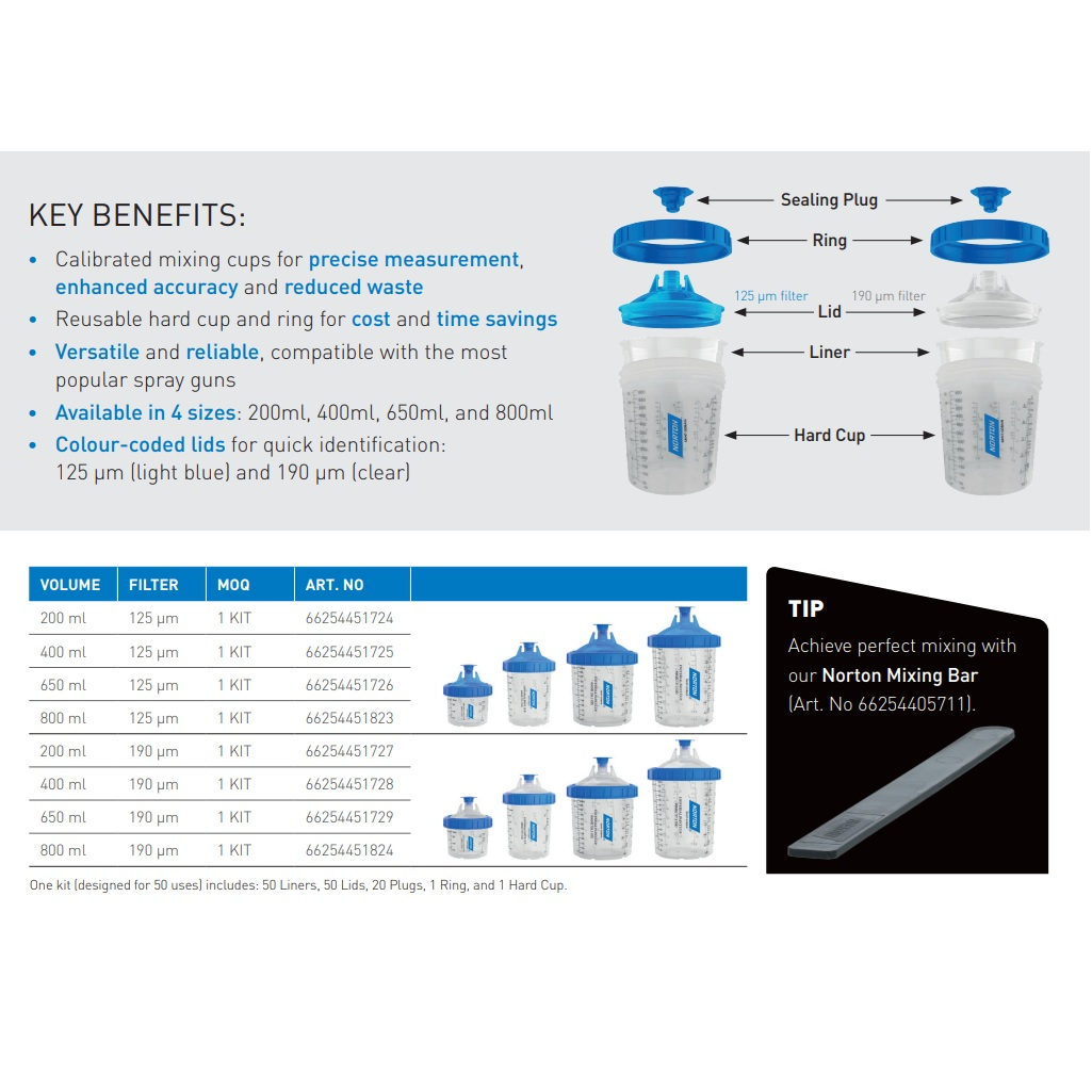 Kitul „Universal Paint Cup” de la Norton este o soluţie completă pentru prepararea, filtrarea şi pulverizarea vopselei, lacului sau grundului, concepută atât pentru utilizatorii profesionişti, cât şi pentru atelierele de vopsire. Compatibil cu cele mai populare adaptoare de pistol de pulverizare, acest kit vă oferă versatilitate, precizie şi economie de timp.
